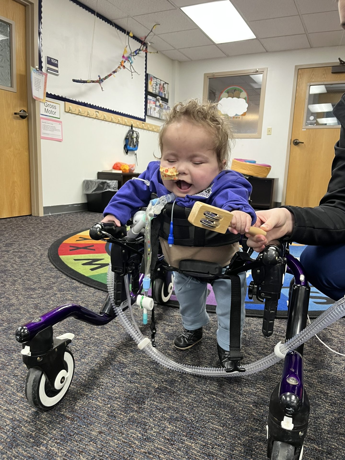 Frankie is spending more time upright in his gait trainer, learning what it means to put weight through his legs. It’s been so exciting to see the neurological conversation between brain and body developing. We are still on only IV nutrition (TPN) right now while we work on getting a second opinion from Children’s Nebraska. Henry is starting speech therapy. His comprehension is advanced but he doesn’t have the words to communicate back with us. We’re hoping this will help him a lot. He’s also starting to visit the 2yr old classroom at daycare to get him ready for the transition so we hope his classmates will model language skills that he’ll pick up.